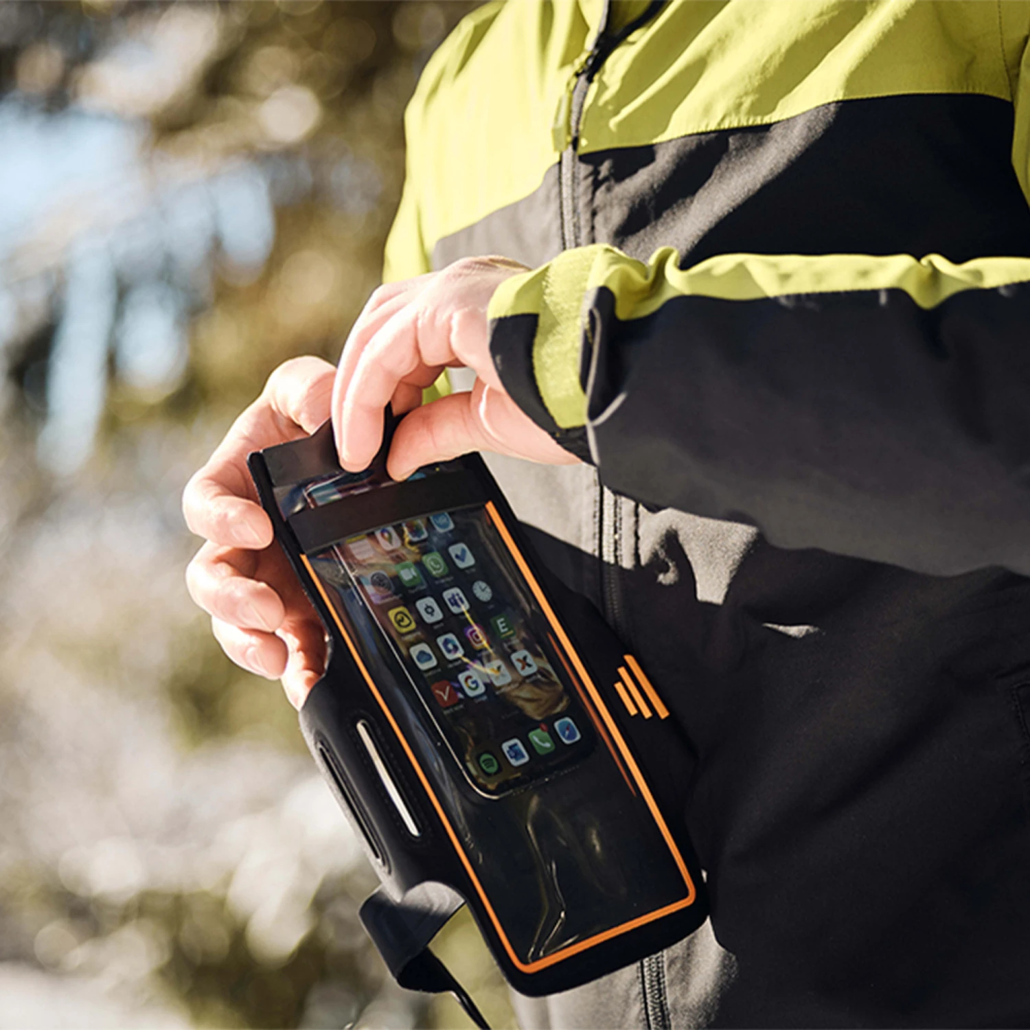 Should you be surprised by a downpour while running, the bag on the upper arm is already prepared. Be it a drizzle or a rain shower – thanks to the hermetic closure technology, the smartphone is 100% protected against water and even the fi nest dust. The HERMETIC arm band is made of skin-friend-ly, elastic material and follows every movement. And thanks to the special fi lm, the smartphone remains touch-enabled. With the included belt extension, the lengthening for larger sizes can be attached quickly and conveniently.