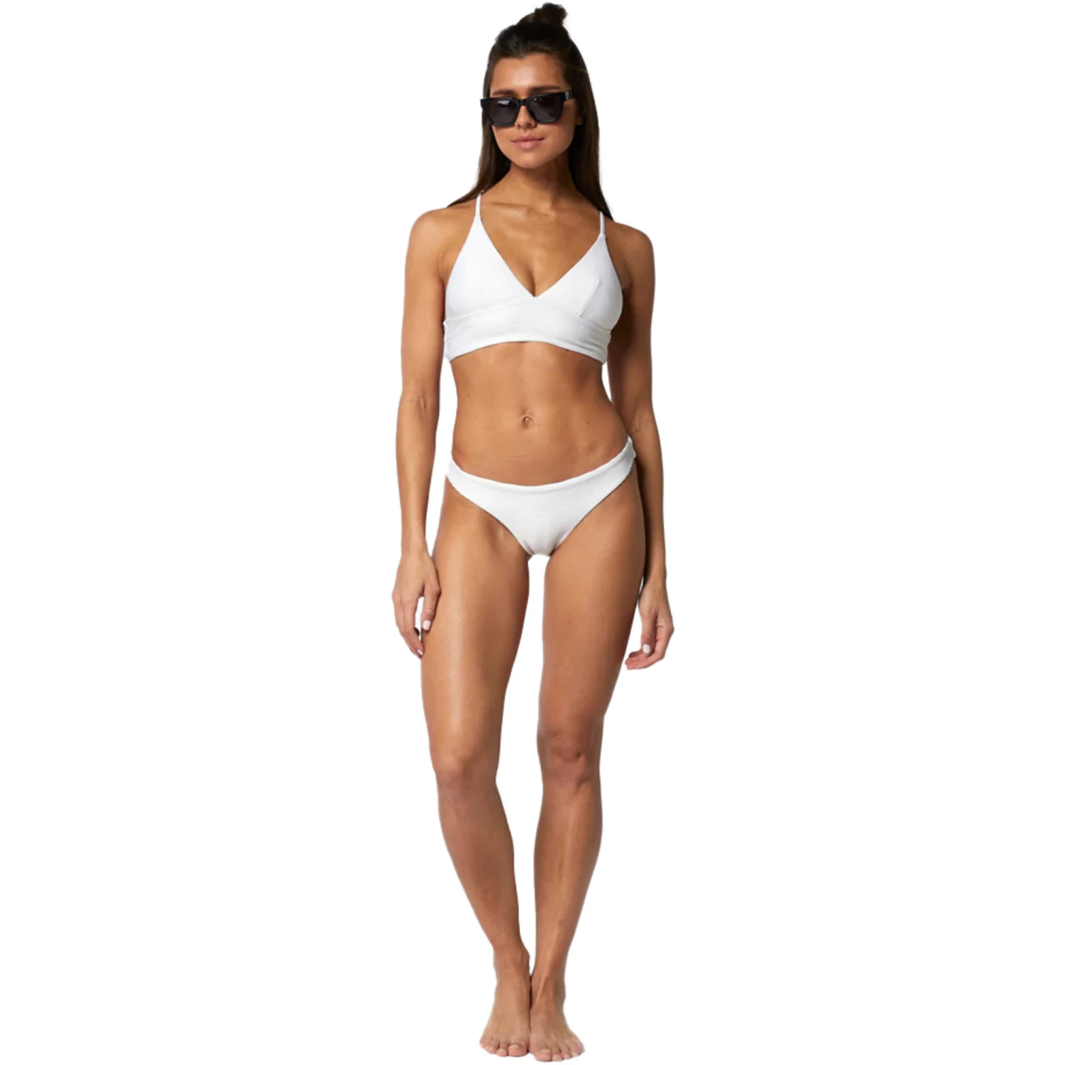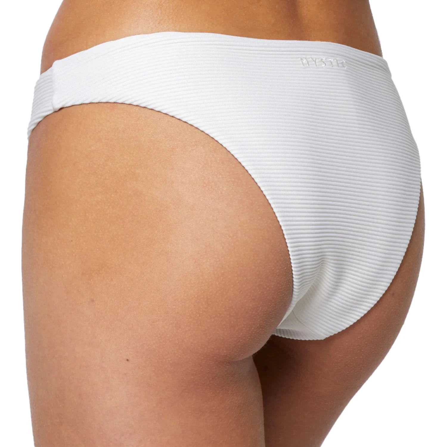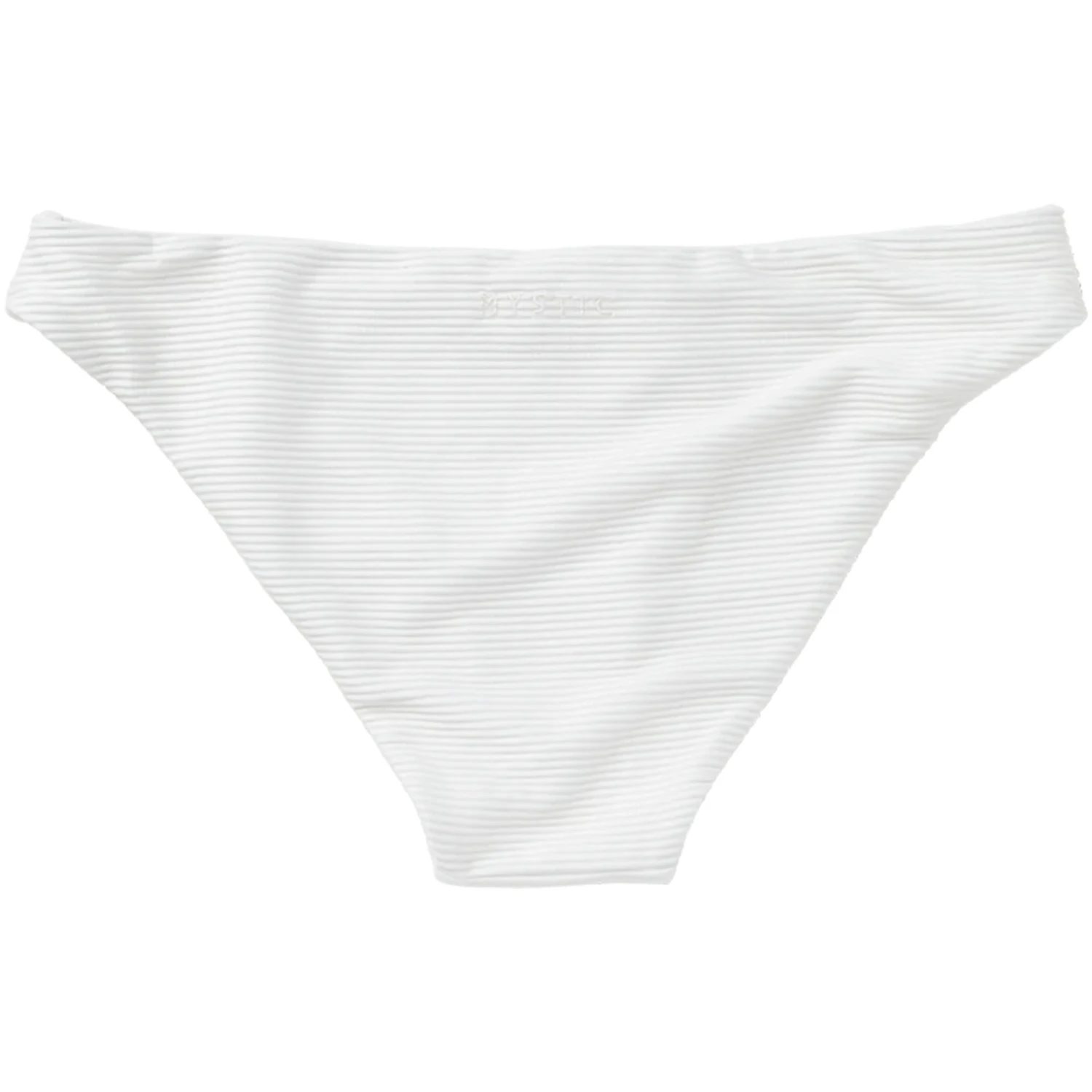 The Frenzy bikini bottom is built of a rib knit material and offers medium coverage. Simple in black or white, we’ve rounded them off with Mystic embroidery at the left front.