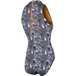 The suit features side seams with a flattering contoured design, a bold and contrasting print design and bright logos and straps.
